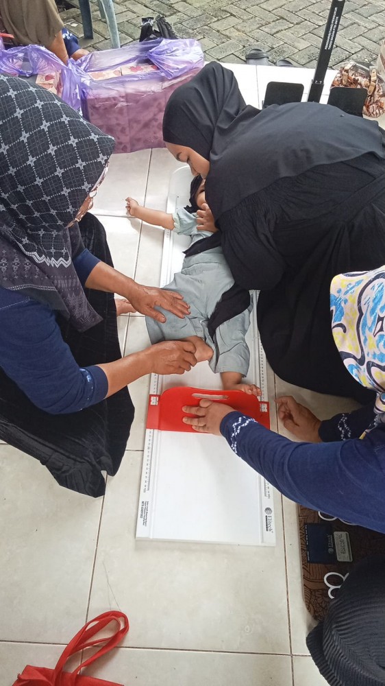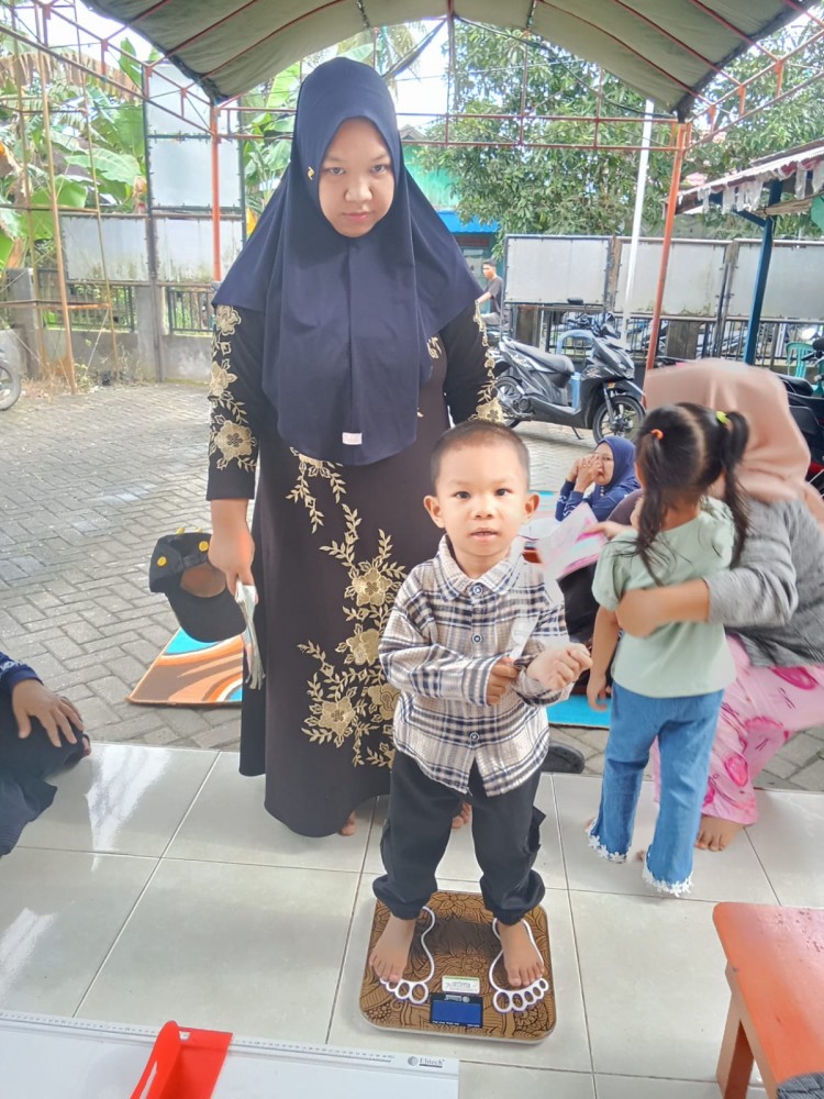 Dalam kegiatan yang berlangsung di halaman posyandu tersebut, petugas kesehatan dan relawan melakukan serangkaian pemeriksaan mulai dari penimbangan berat badan, pengukuran tinggi badan, hingga pemeriksaan kondisi kesehatan umum balita. Seperti terlihat pada salah satu sesi, seorang balita sedang diperiksa dan ditimbang sambil didampingi oleh orang tua dan petugas dengan penuh perhatian.